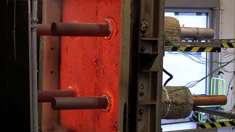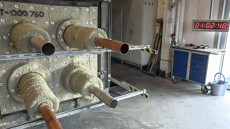 此测试是在确定时间段内,针对穿隔位保持其完整性和绝热性能,对该密封系统进行检查。 火焰不能穿透密封系统,同时也不能导致背火面有气体引燃现象。 通常情况下,A-60 防火隔断意味着 1 小时内,测温点的温升幅度最多 180°C。