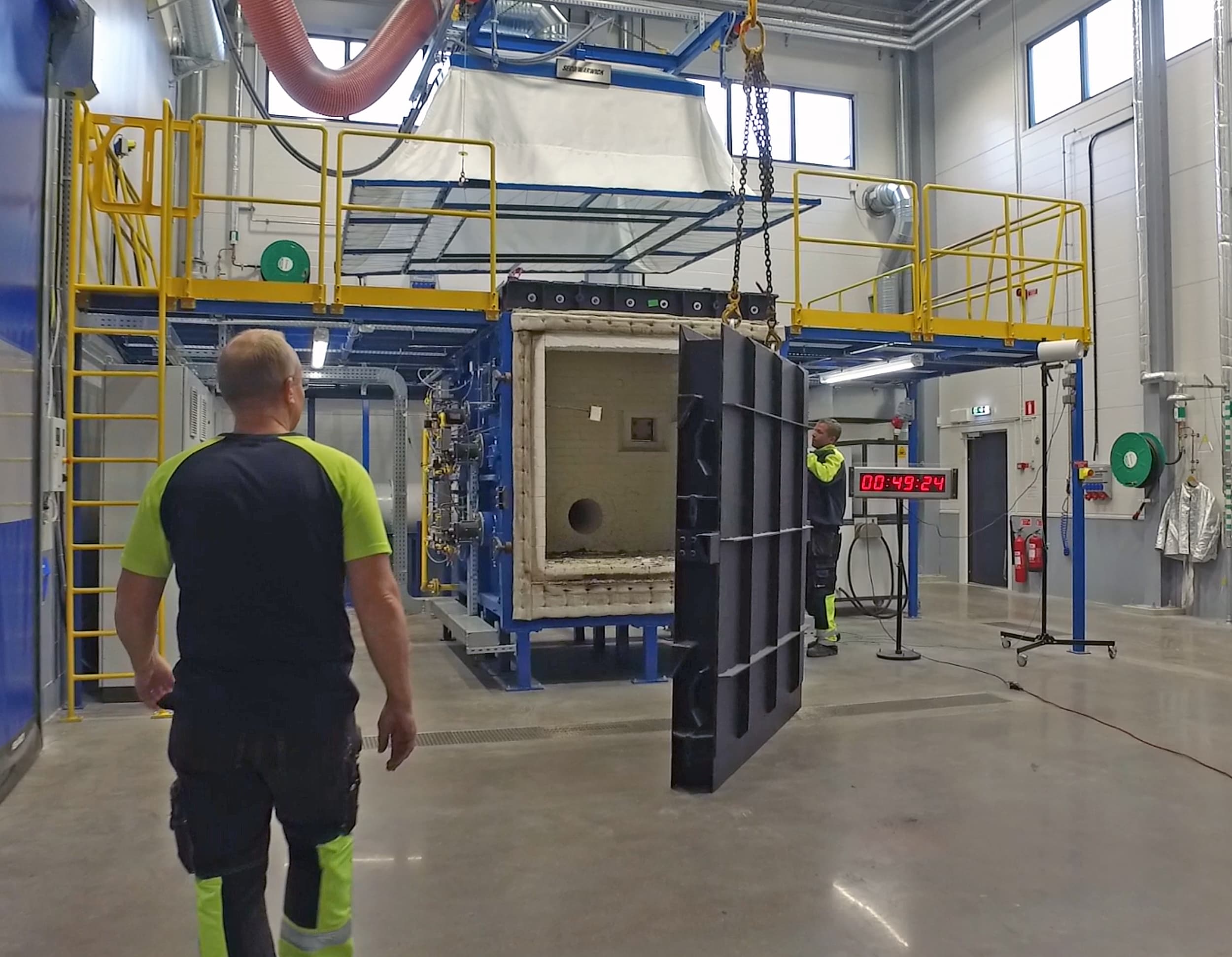 可以邀请客户和船级社代表在观察室内见证测试。 通过大窗户,他们可以看到带测试炉的炉厅。 他们还可以通过网络从世界任何地方观看测试。